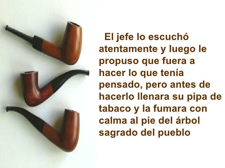 El jefe lo escuchó atentamente y luego le propuso que fuera a hacer lo que tenía pensado, pero, que, antes de hacerlo, llenara su pipa de tabaco y la fumara con calma al pie del árbol sagrado del pueblo.